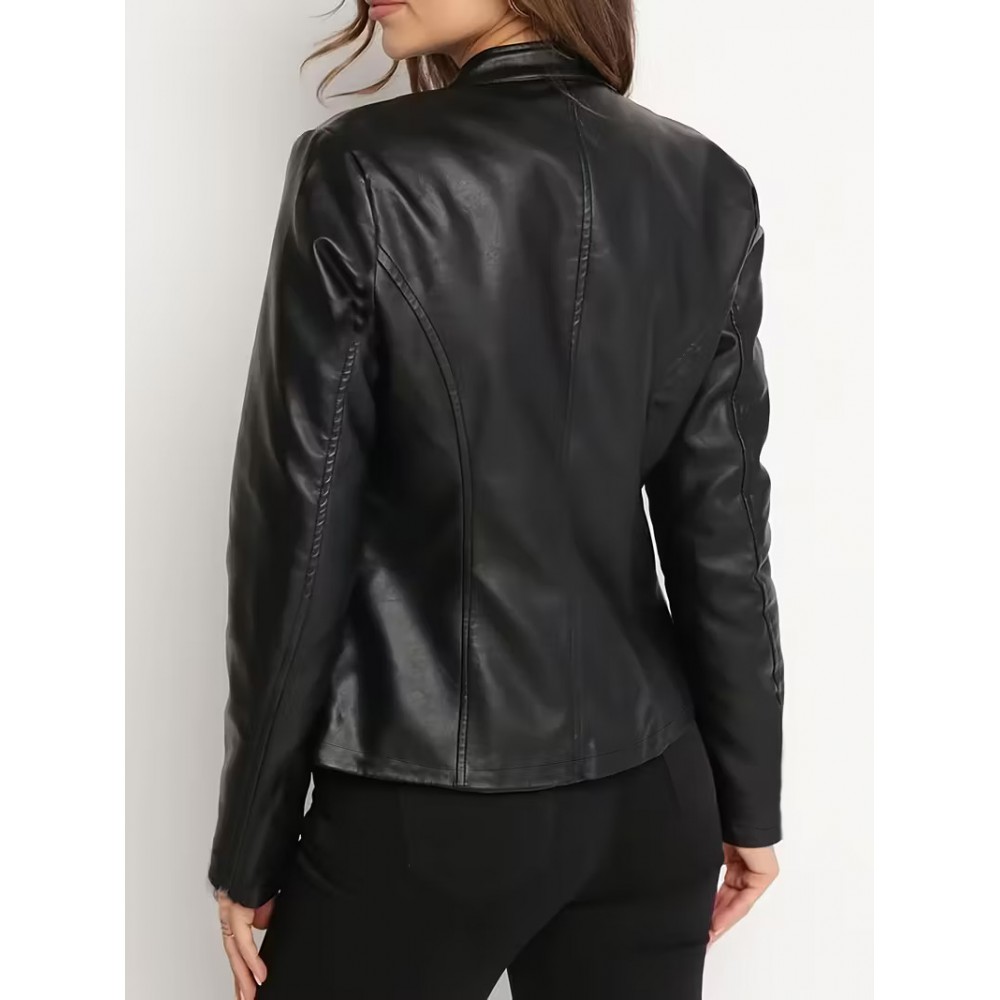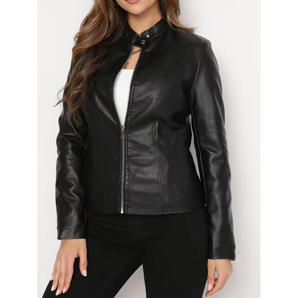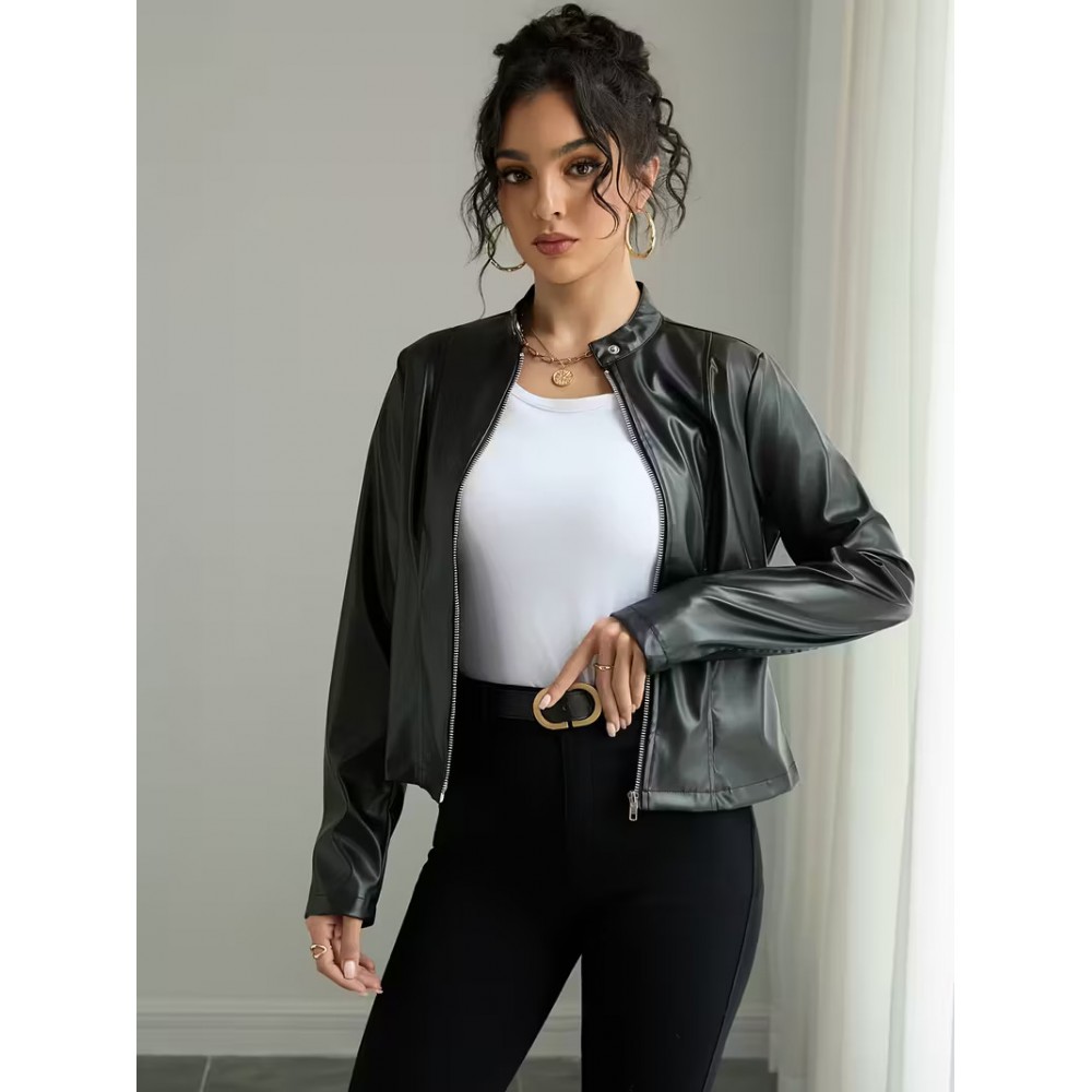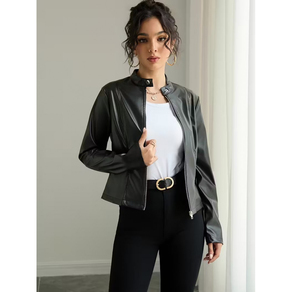 Deri Ceket - Tam Fermuarlı Uzun Kollu Motosiklet Montu, Dik Yaka 251014114858